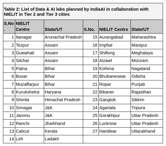 Setting up data labs in Tier 2 and Tier 3 cities: The FutureSkills pillar under the Mission seeks to increase the number of graduates, postgraduates, and PhDs specializing in AI. Additionally, it seeks to establish data and AI Labs in Tier 2 and Tier 3 cities across India to provide foundational courses in data and AI. MeitY informed Parliament that all 36 states and UTs have been asked to nominate Industrial Training Institutes (ITIs)/polytechnics in Tier 2 and Tier 3 cities for establishing data labs. IndiaAI, in collaboration with the National Institute of Electronics & Information Technology (NIELIT) also plans to set up 27 Data Labs in these cities (See Table 2).