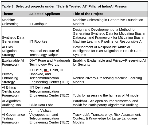 Responsible AI Projects: The Safe & Trusted AI pillar under the Mission focuses on implementing Responsible AI initiatives, including developing indigenous tools, self-assessment checklists, and governance frameworks. Eight projects have been selected to establish robust guardrails for the responsible development and use of AI technologies (See Table 3). Note that these projects were selected against the Expression of Interest (EoI) floated under the Safe and Trusted AI pillar of the Mission. Over 2,000 proposals from academic institutions, start-ups, research organizations, and civil society were evaluated by a multi-stakeholder committee, leading to the selection of eight projects.